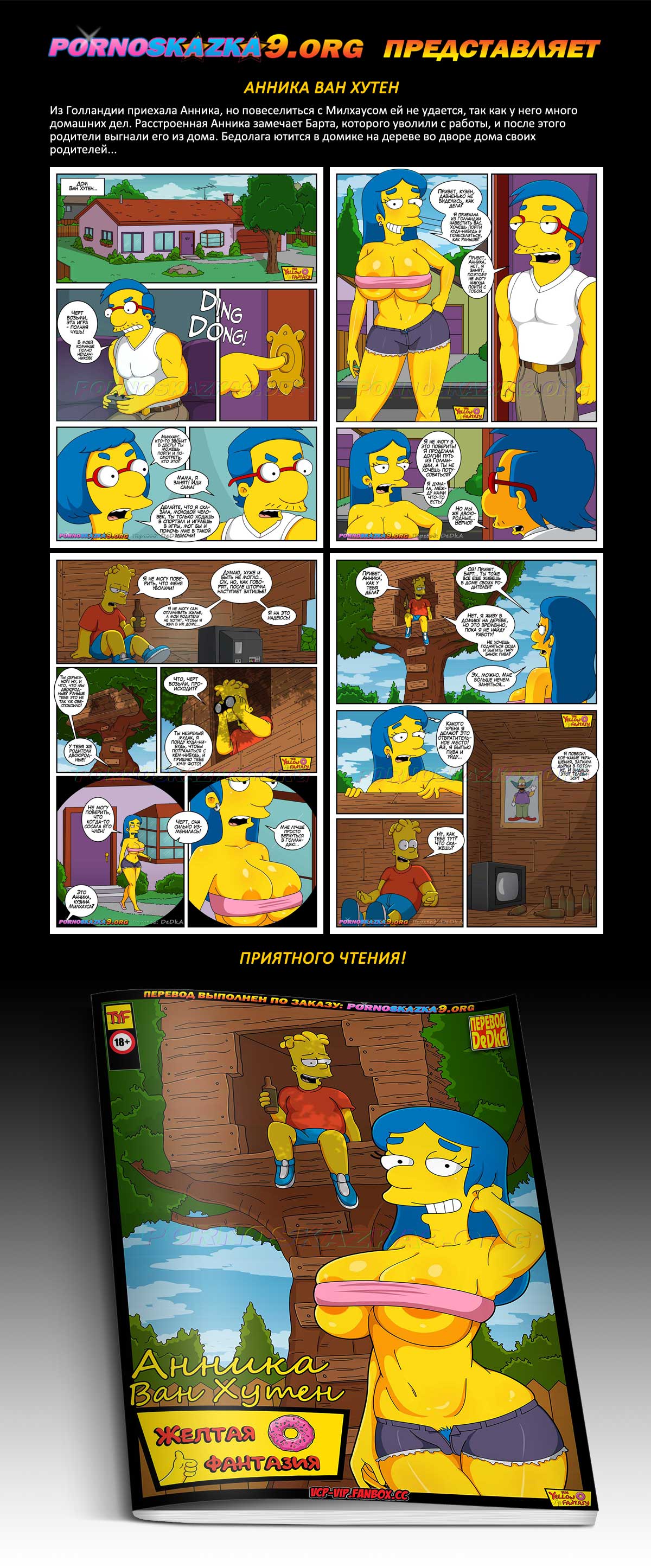 Порно комикс «Анника Ван Хутен.» Из Голландии приехала Анника, но повеселиться с Милхаусом ей не удается, так как у него много домашних дел. Расстроенная Анника замечает Барта, которого уволили с работы, и после этого родители выгнали его из дома. Бедолага ютится в домике на дереве во дворе дома своих родителей…